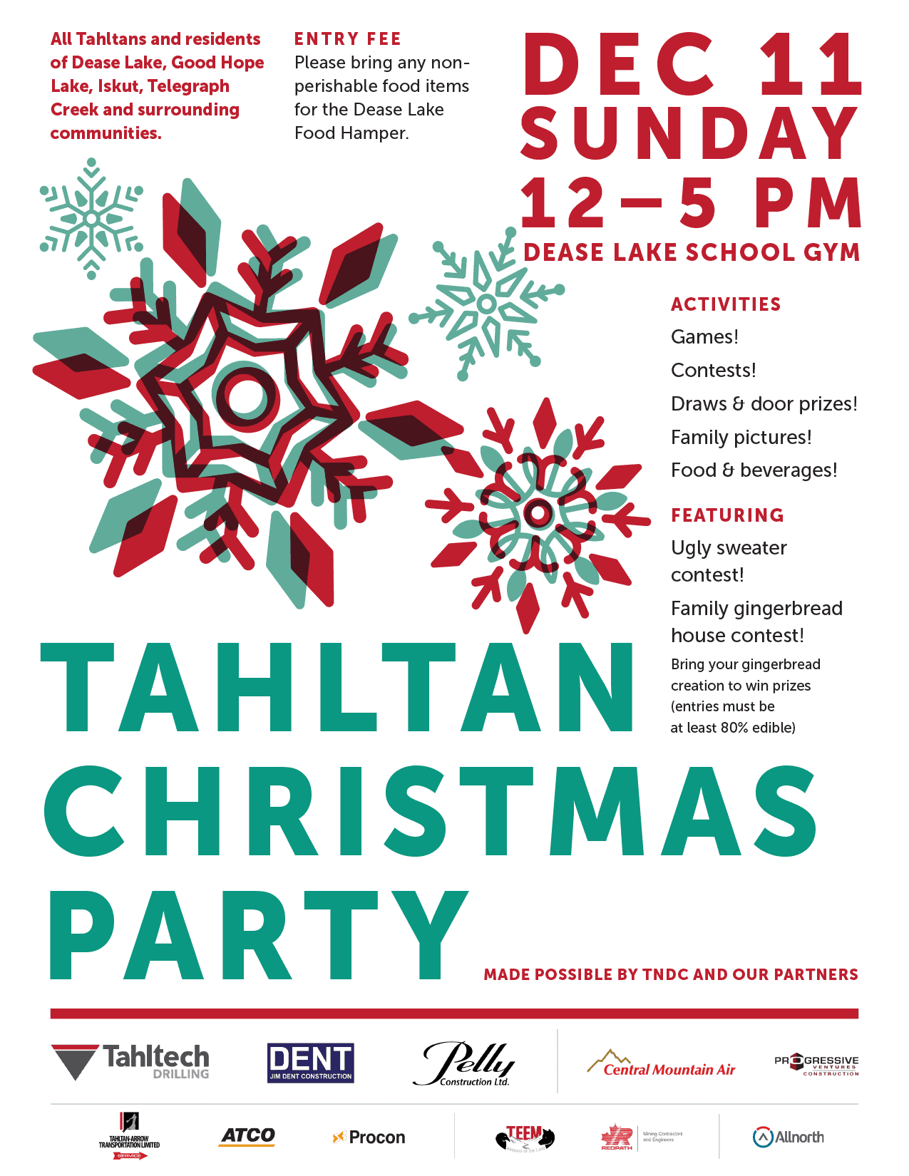 It is that time of year and the countdown is on! Planning for TNDC’s annual Tahltan Community Christmas Party are underway. The Party will be held Sunday, December 11th in Dease Lake. This year’s event is being brought to the community by TNDC and our Business Partners.