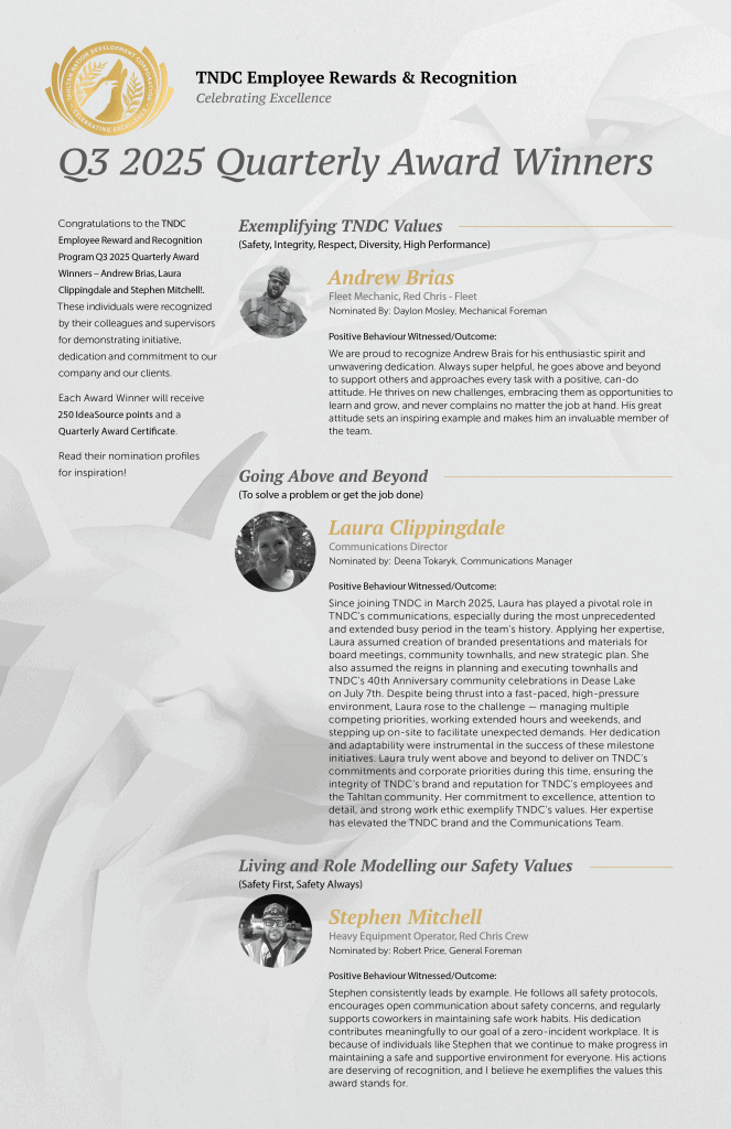 TNDC’s communications, especially during the most unprecedented and extended busy period in the team’s history. Applying her expertise, Laura assumed creation of branded presentations and materials for board meetings, community townhalls, and new strategic plan. She also assumed the reigns in planning and executing townhalls and TNDC’s 40th Anniversary community celebrations in Dease Lake on July 7th. Despite being thrust into a fast-paced, high-pressure environment, Laura rose to the challenge — managing multiple competing priorities, working extended hours and weekends, and stepping up on-site to facilitate unexpected demands. Her dedication and adaptability were instrumental in the success of these milestone initiatives. Laura truly went above and beyond to deliver on TNDC’s commitments and corporate priorities during this time, ensuring the integrity of TNDC’s brand and reputation for TNDC’s employees and the Tahltan community. Her commitment to excellence, attention to detail, and strong work ethic exemplify TNDC’s values. Her expertise has elevated the TNDC brand and the Communications Team.