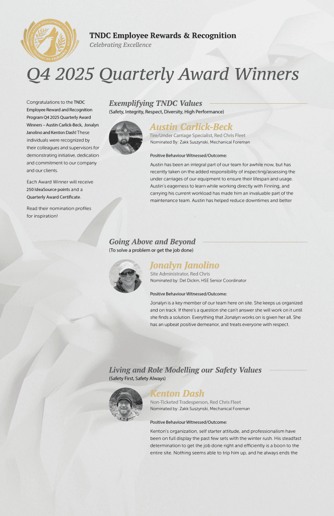 TNDC is excited to announce the winners of our 2025 Quarterly Awards – Q3 and Q4 Recipients! The TNDC Rewards and Recognition Program celebrates TNDC employees who demonstrate initiative, dedication and commitment to our company and our clients. These recipients were nominated by another staff member (colleague or supervisor) across three areas. The winners receive a Quarterly Award Certificate and 250 IdeaSource points. Congratulations!